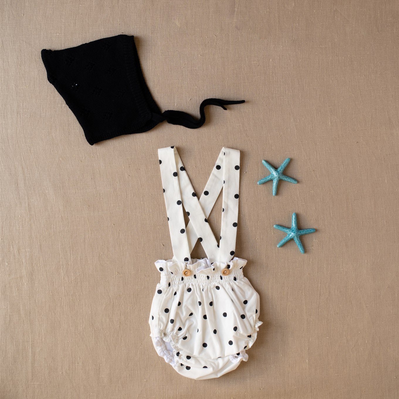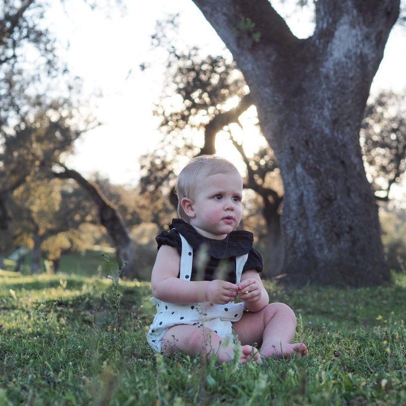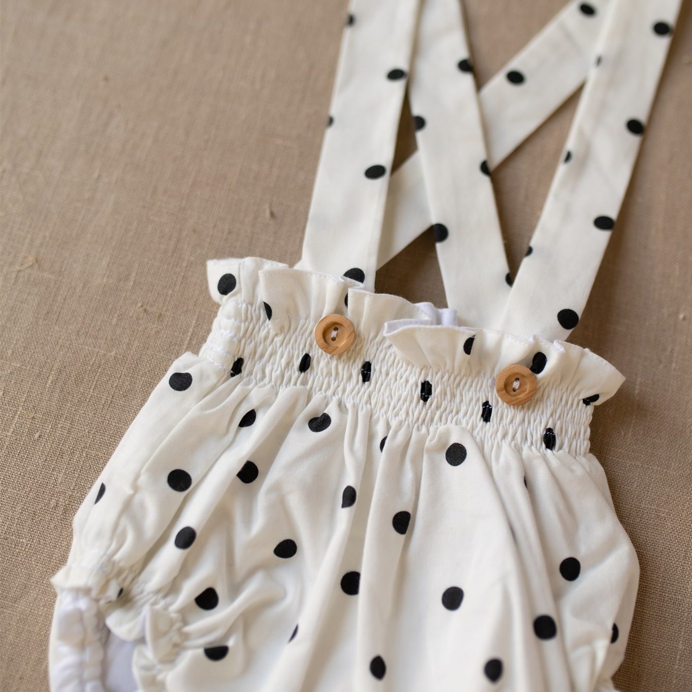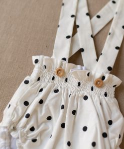 Nuestra braguita de tirantes es una prenda ideal para lo más peques de la casa, es muy versátil ya que podamos usarla con tirantes por fuera de cualquier prenda o sin tirantes como un cubrepañal. Es de estampado exclusivo para iló-liló con lunares negros sobre fondo crudo, ajustable gracias a sus tirantes que van abotonados con unos ideales botones de madera y un elástico que sujeta pero no aprieta en cintura y piernas.