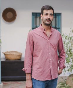 La camisa almez hombre va abotonada por delante con botones pequeños de madera. El cuello también va abotonado. Tiene un botón pequeño en el puño.