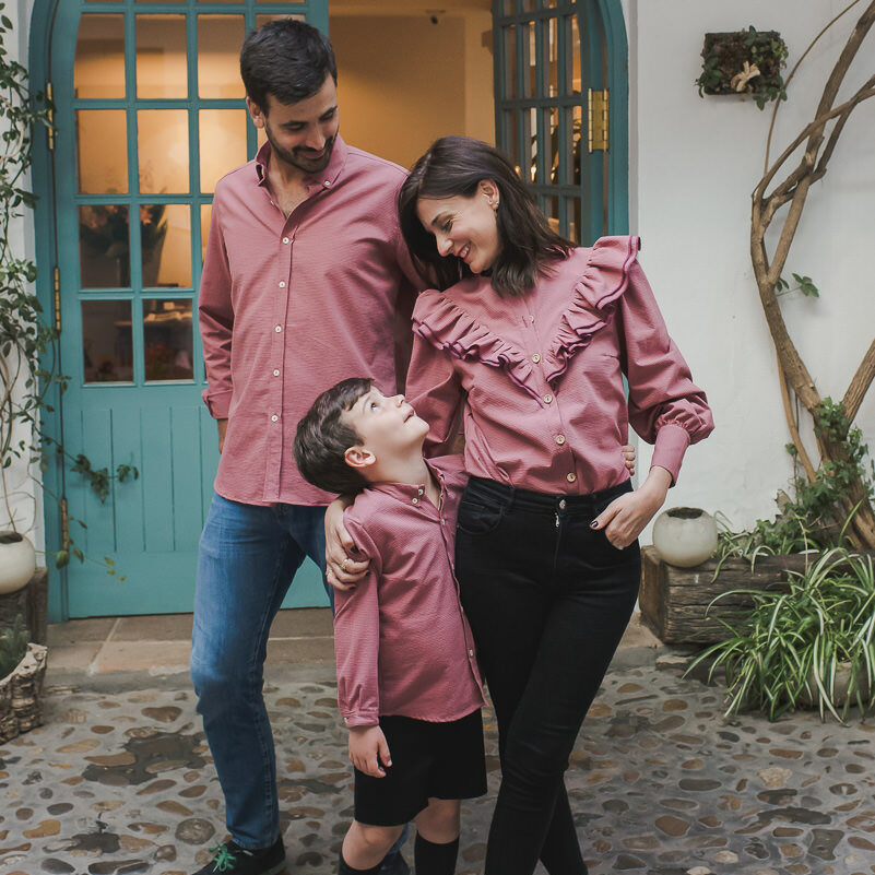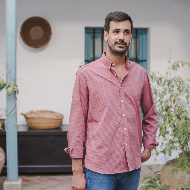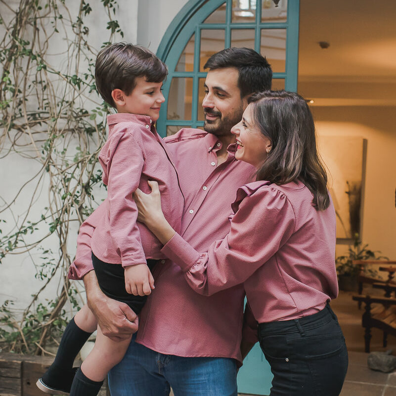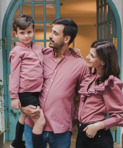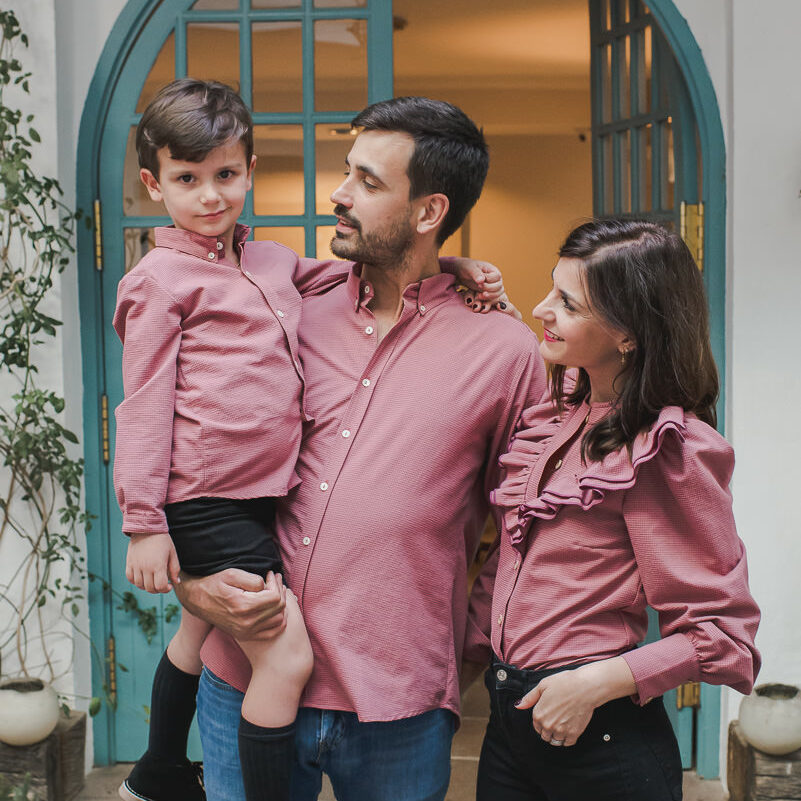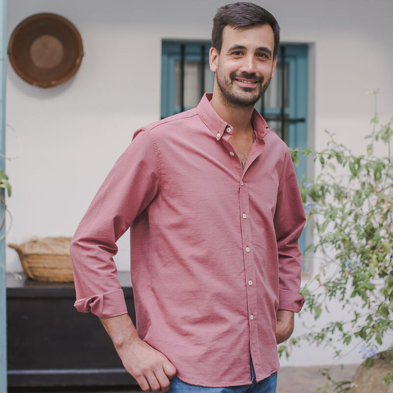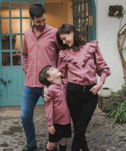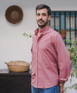 Camisa de cuadros rosas vichy.Tiene botones en el cuello. Manga larga con terminación en puño abotonado.Logo bordado a la altura del costado izquierdo. Es entera abotonada por la parte delantera, incluido el cuello. Botones de madera.Los puños cierran con un botón pequeño.