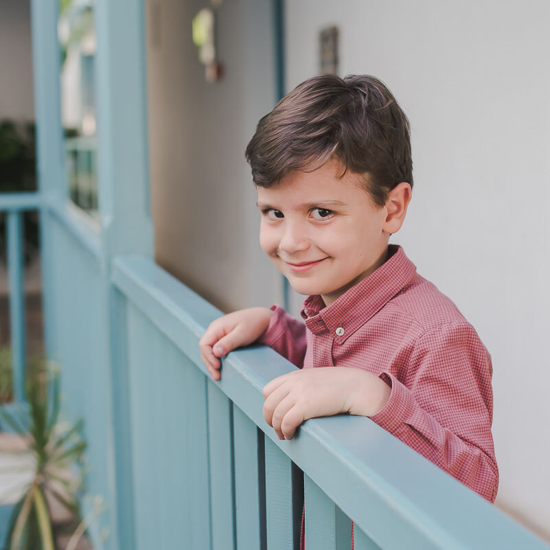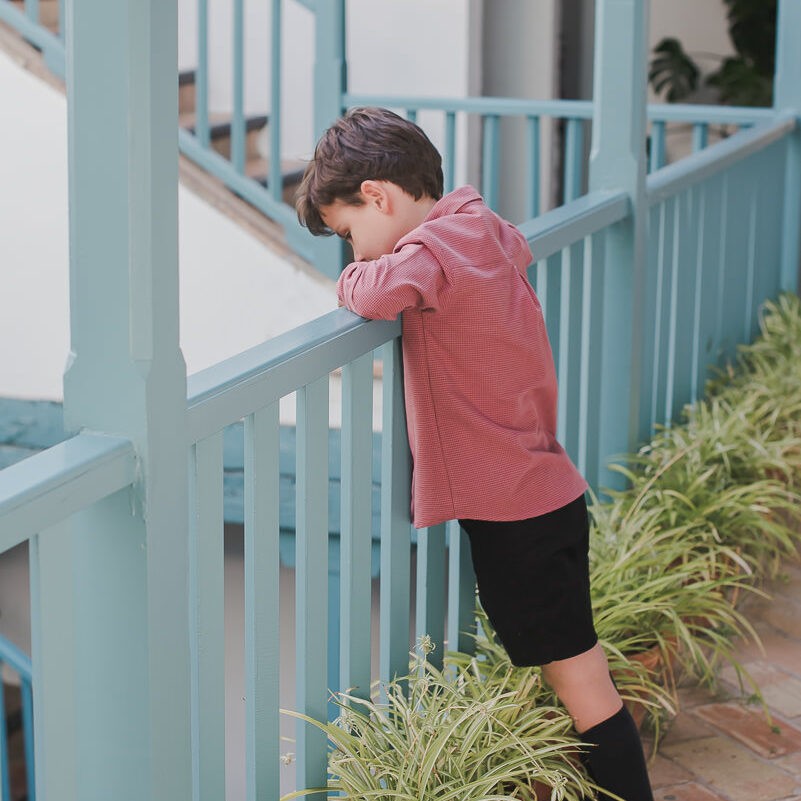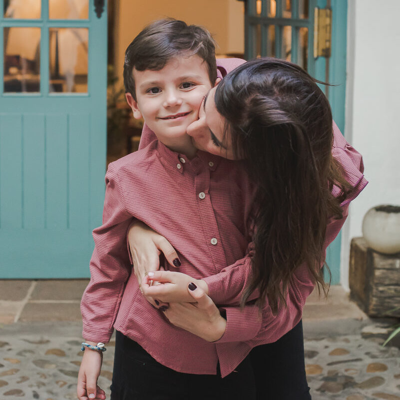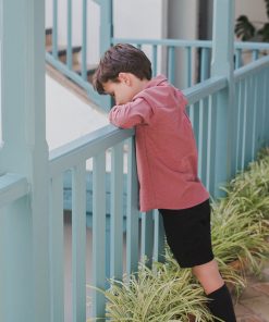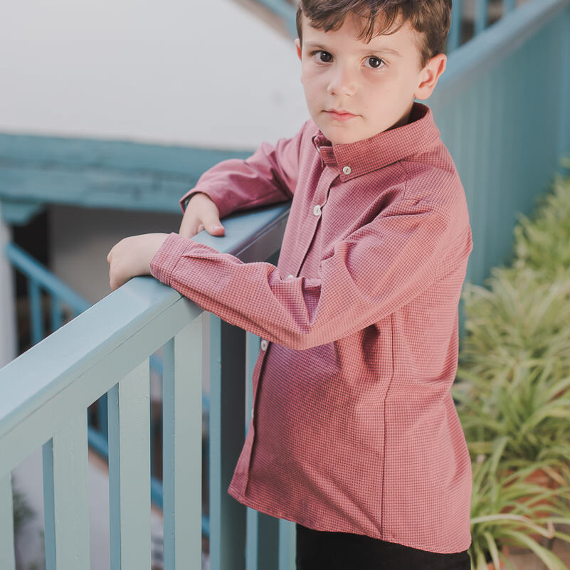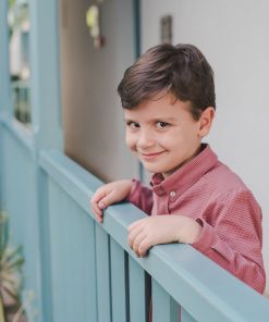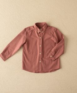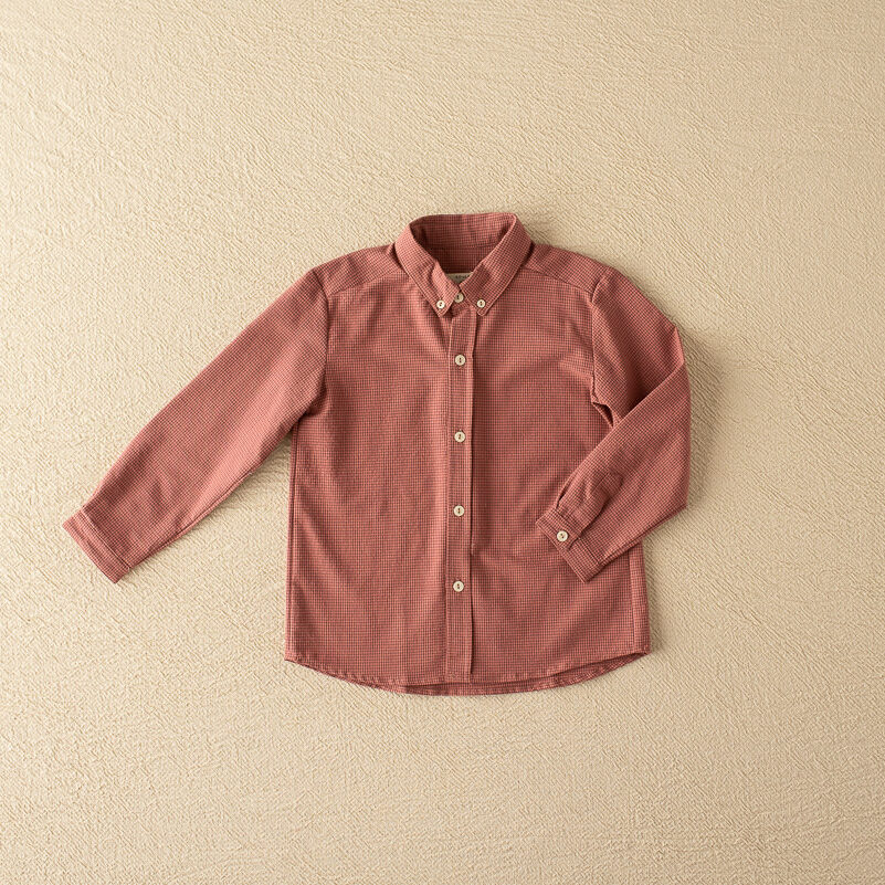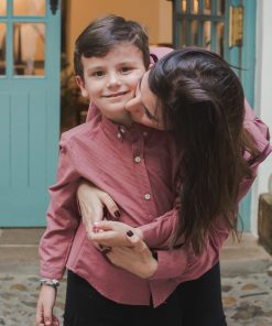 La camisa almez de niño va abotonada por delante con botones pequeños de madera. El cuello también va abotonado. Tiene un botón pequeño en el puño.