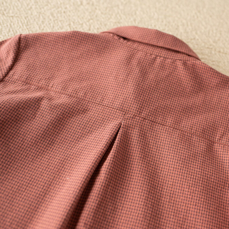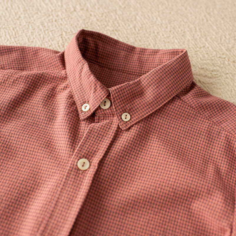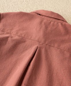 Camisa de cuadros rosas vichy. Tiene botones en el cuello. Manga larga con terminación en puño abotonado. Logo bordado a la altura del costado izquierdo. Es entera abotonada por la parte delantera, incluido el cuello. Botones de madera. Los puños cierran con un botón pequeño.