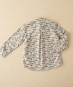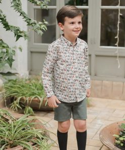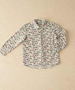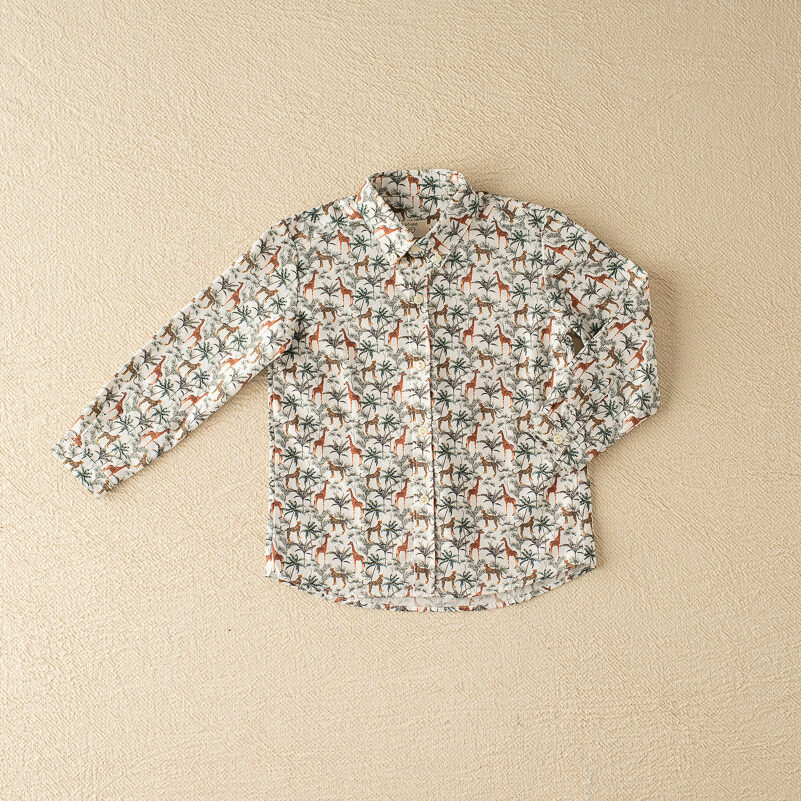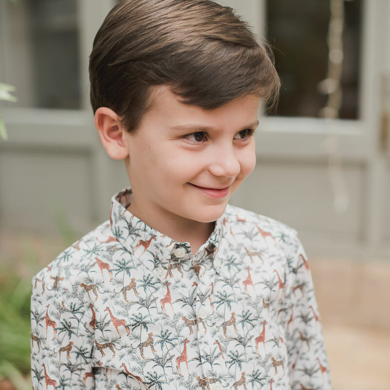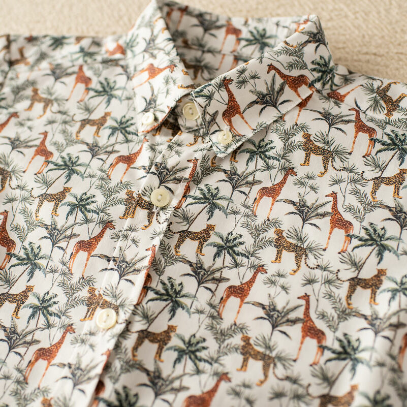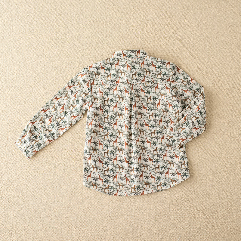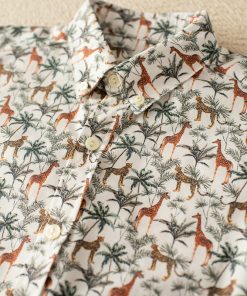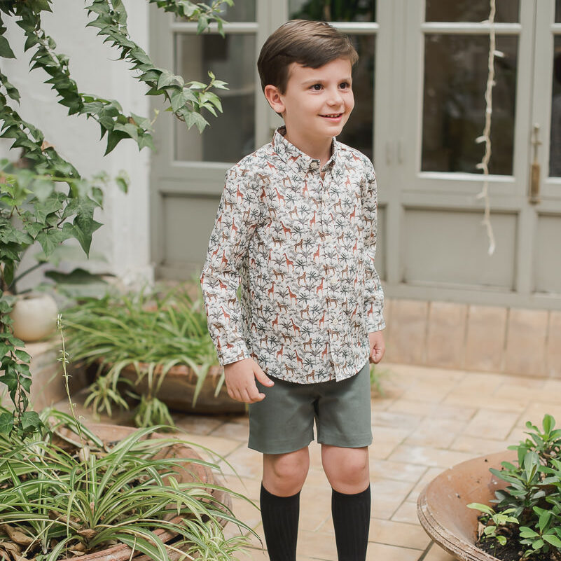 La camisa filifera va abotonada por delante con botones pequeños de madera. El cuello también va abotonado. Tiene un botón pequeño en el puño. La camisa tiene un estampado exclusivo de iló-liló con palmeras en tonos verdes y jirafas ideal y súper favorecedor.