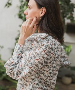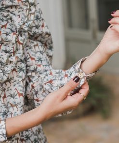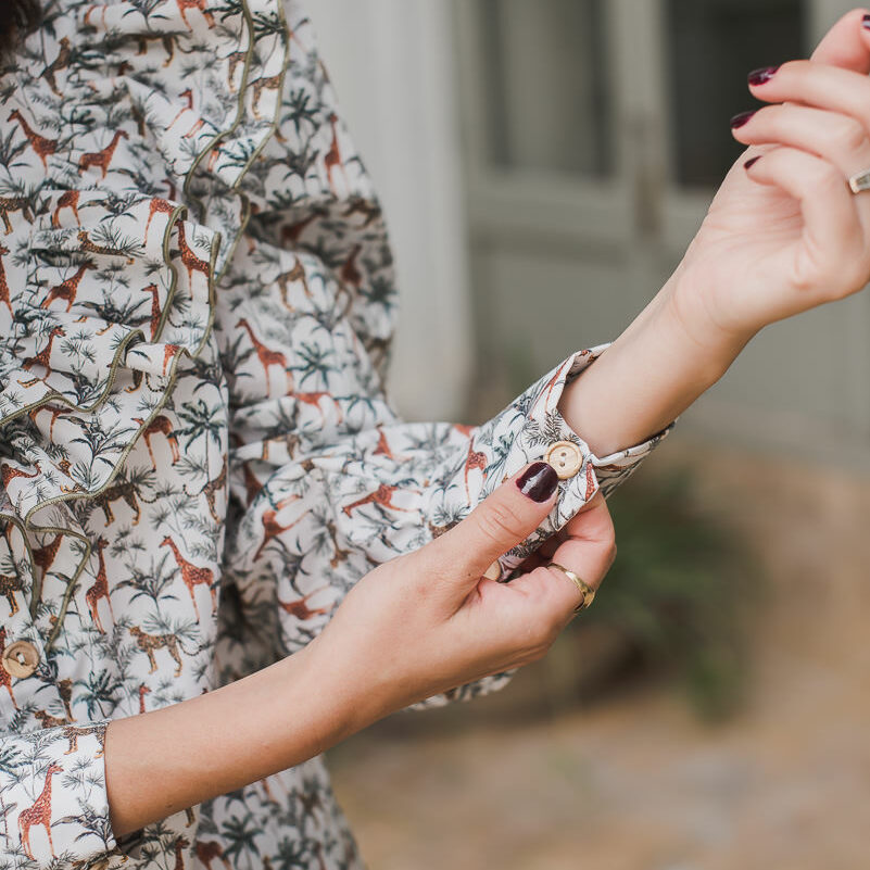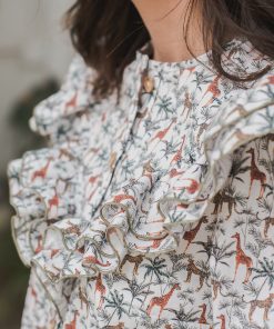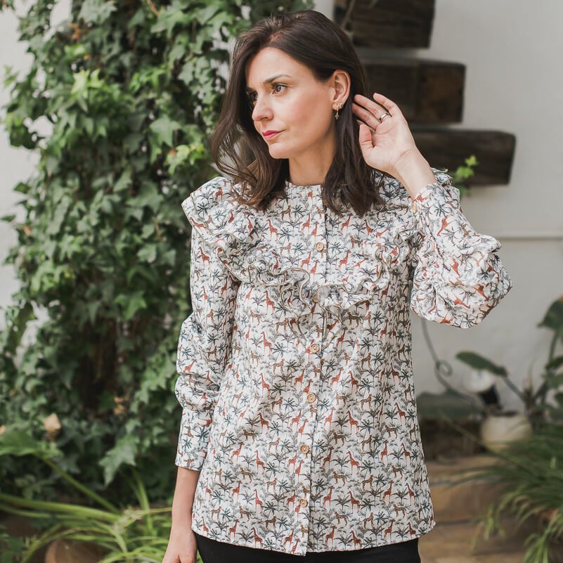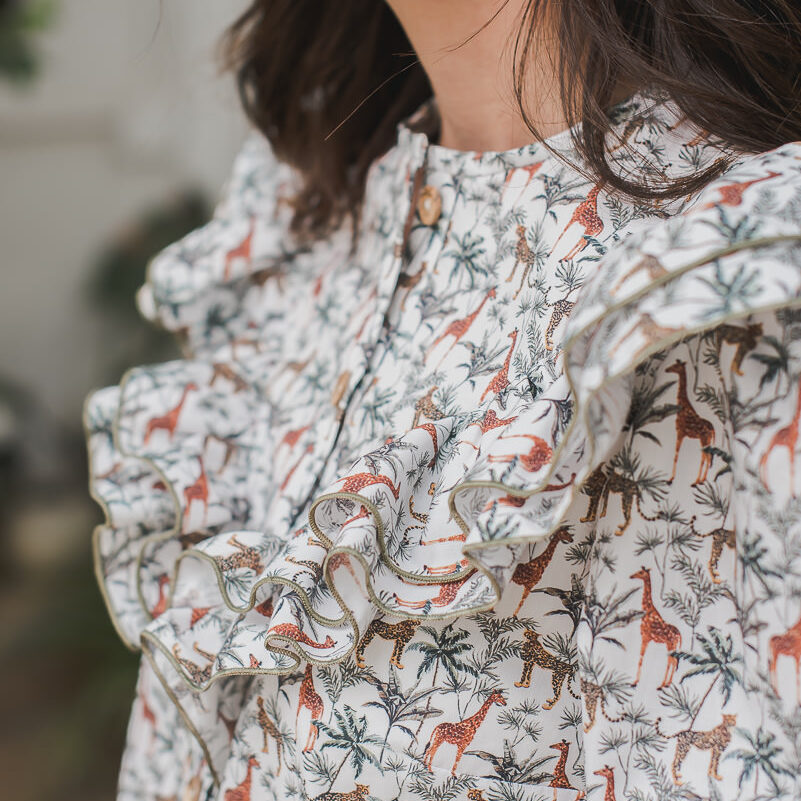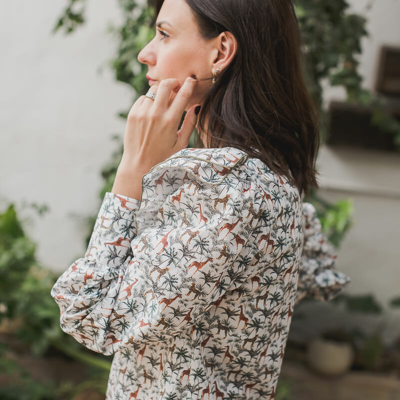 La camisa de mujer es de un estampado exclusivo de ilo-lilo con jirafas y palmeras en tonos naranjas y verdes. Tiene cuello en pico con volantito en el mismo tejido. Se abrocha por delante con botones de madera y tiene un cuello redondo. Su manga es de farol y puño ajusto, favoreciendo asi muchisimo.