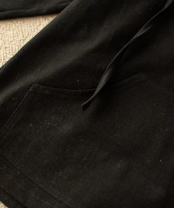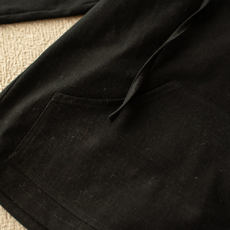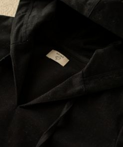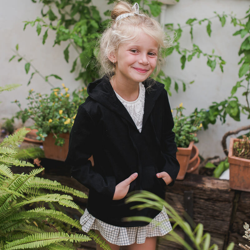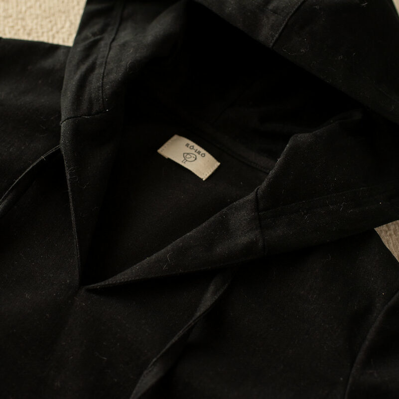 Nuestra chaqueta catalpa esta diseñada en un tejido de sarga negra con mangas largas y capucha. Tiene un bolsillo a modo canguro en la barriguita y tiene cordones en el cuello abierto en pico.