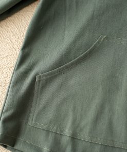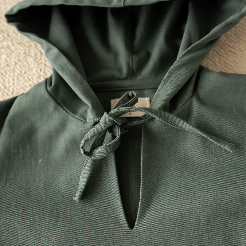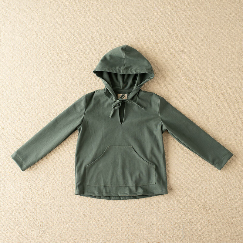 Nuestra chaqueta haya esta diseñada en un tejido de sarga verde con mangas largas y capucha. Tiene un bolsillo a modo canguro en la barriguita y tiene cordones en el cuello abierto en pico.