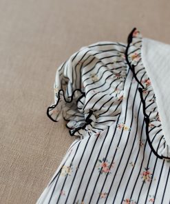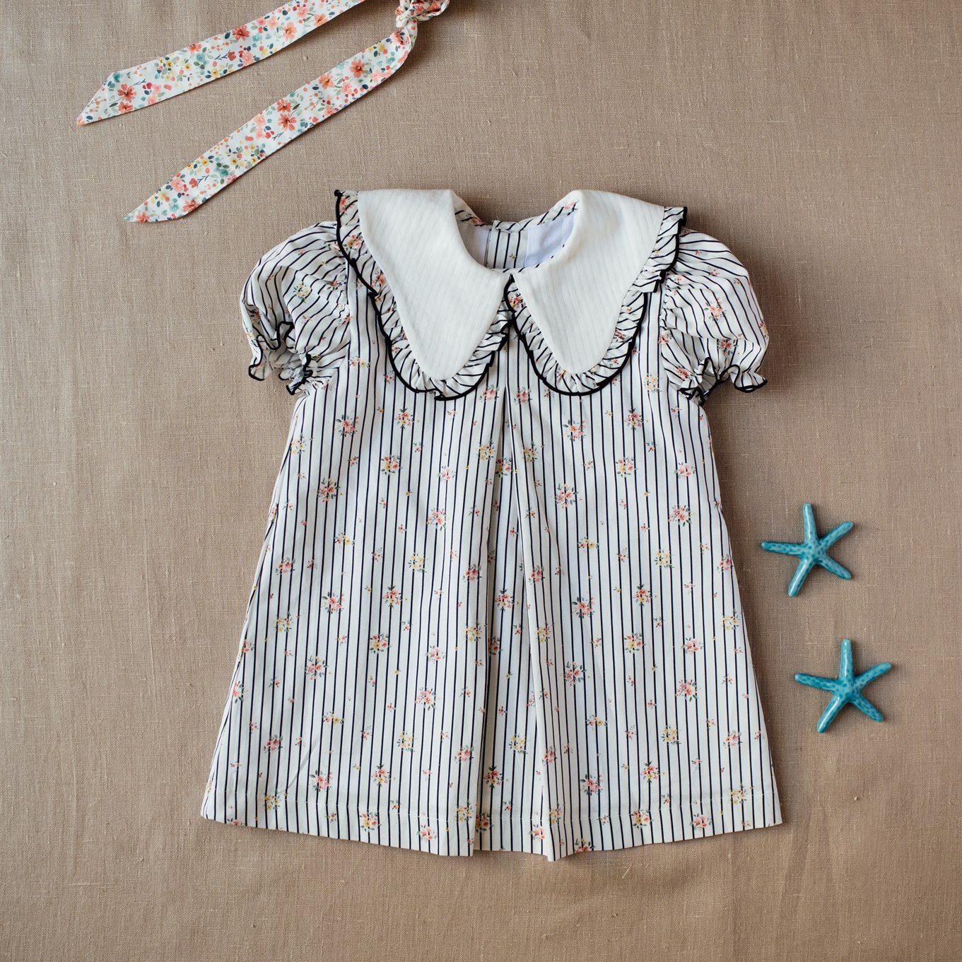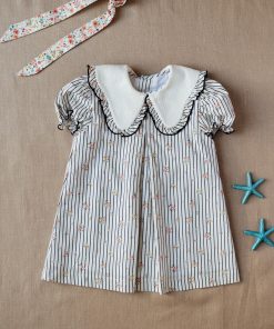 El Jesusito Azores es de un estampado exclusivo de iló-liló con flores y rayas negras, las flores son en tonos rosas, verde agua y amarillos. El jesusito tiene cuello bobo, en tono blanco con volantito en el estampado.