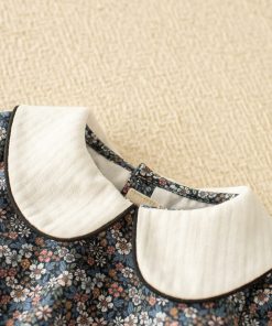 Pelele cuello bebé acacia es un body de manga larga y cuello de bebé grande que termina con un filito en tono negro. El pelele tiene un estampado de flores en tonos blancos, rosa, verde y mostaza sobre un fondo negro. Su cuello es en tono marfil favoreciendo muchísimo a la cara.