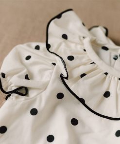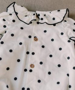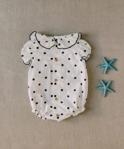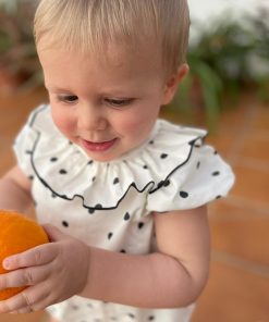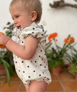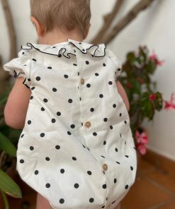 Nuestro Corcega pelele de manga corta es diseño exclusivo de iló-lilo tejido en algodón 100%. El pelele es de lunares negros sobre un fondo crudo, cuello de volante repulgado en negro con las manguitas cortas en forma de farol súper favorecedor para lo más pequeños de la casa.