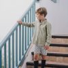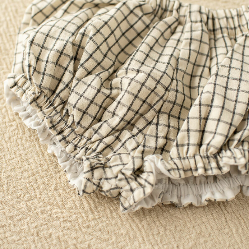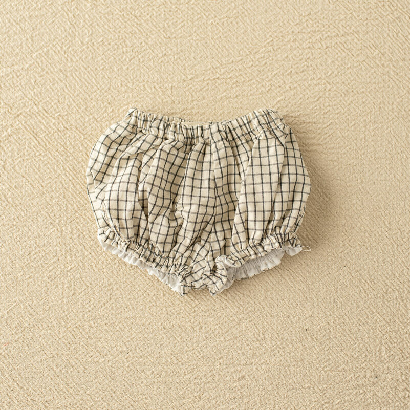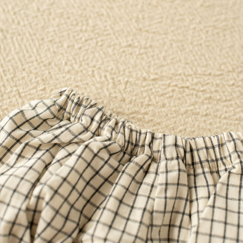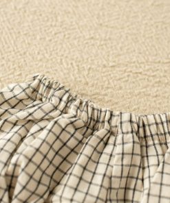 Pololo Olmo es de un tejido 100% algodón. Su estampado es de tono crudo con líneas negras que hacen cuadros.