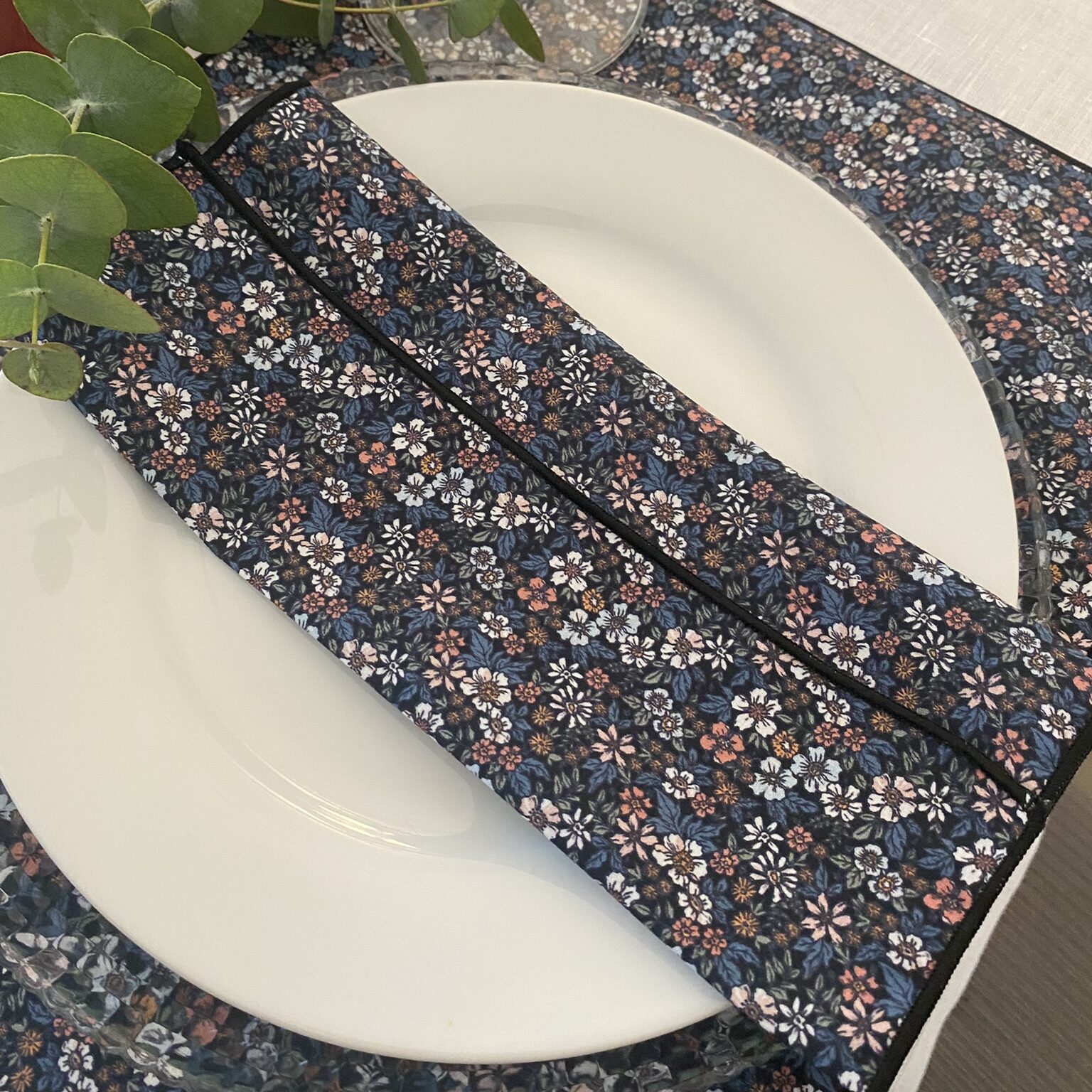 Nuestras servilletas acacia tienen un diseño exclusivo de ilo-lilo con un estampado en tonos rosas pastel, blancas y azules sobre un fondo negro rematado en hilo negro que le aporta un toque elegante y moderno.