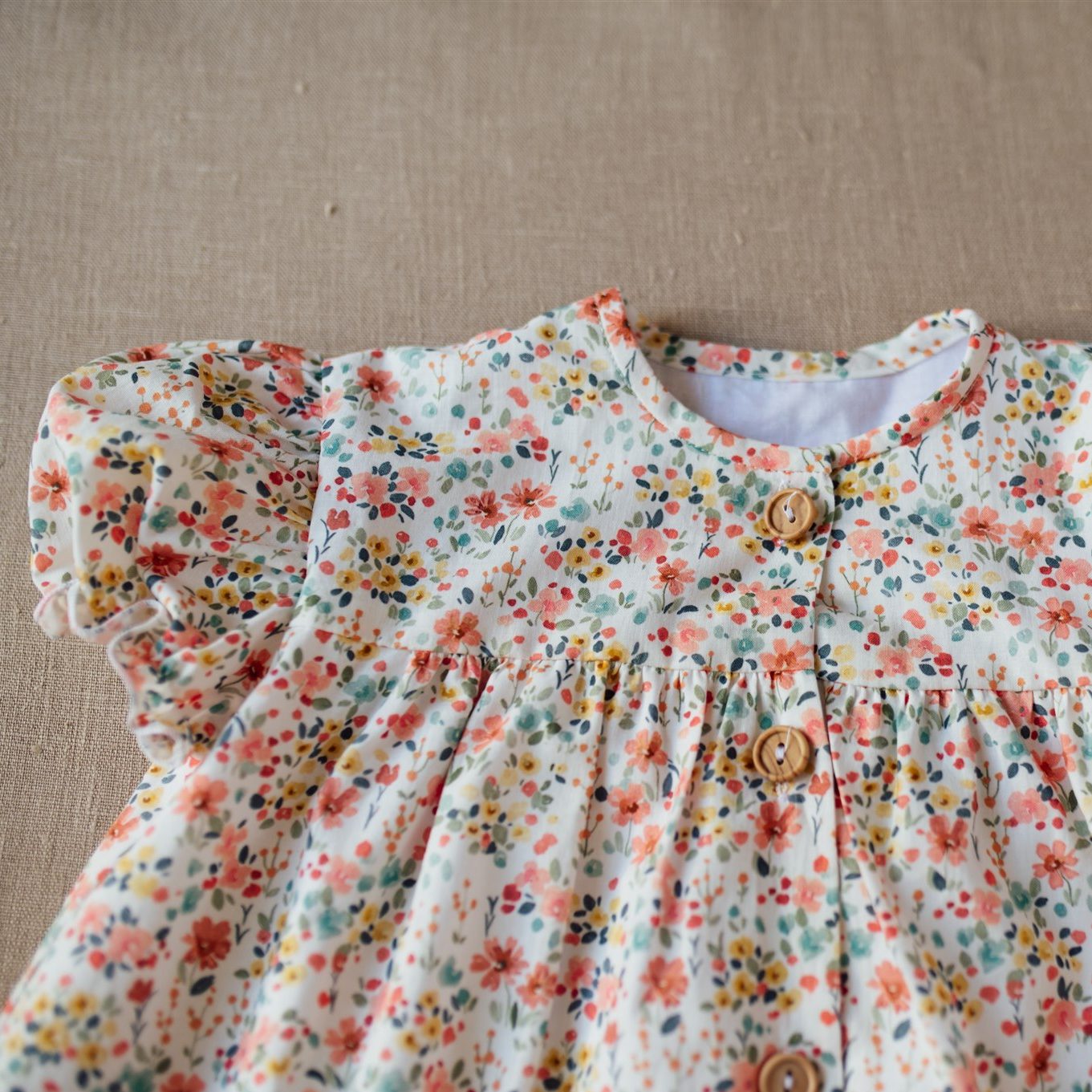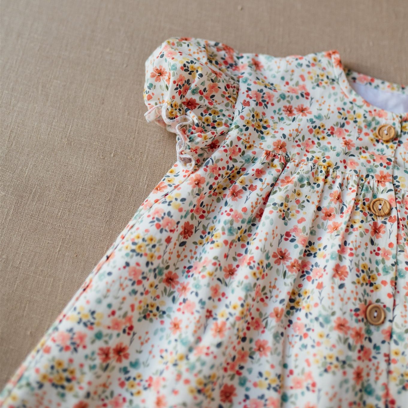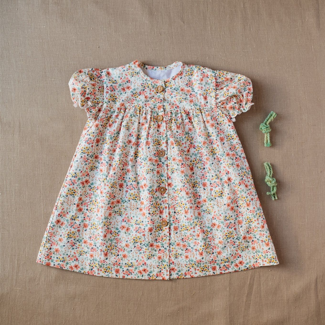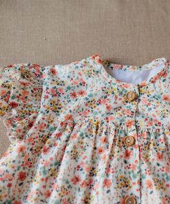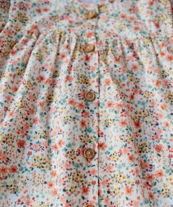 El vestido Mareira tiene un tejido estampado de flores amarillas, coral y verde agua sobre fondo blanco. Tiene el cuello a la caja, la manga corta farol y corte en el pecho que les favorece mucho a las chicas de la casa. Cierra delante con unos botones de madera.